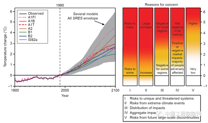 值得关注的是,TAR引入了5个“关切理由”(reasonsfor concern),“概念性”地表达了重视气候变化风险的原因(图1)包括:独特和濒危系统的风险、极端天气气候事件风险、影响的分布、综合影响,以及未来大规模突发事件的风险。该图用全球年平均温度代表气候变化的强度,但特别指出未来的影响将是全球和区域平均气候变化强度、速度、气候变率和极端气候现象、社会和经济状况以及适应性的函数,其取决于多个方面。报告认为,设定避免“气候系统受到危险的人为干扰”水平的战略、目标和时间表时,需要考虑气候、生态和社会经济系统存在的惯性和不确定性,从更为综合和直观的角度,评估气候变化可能带来的风险,并且将其与全球平均温度相联系。如图1所示,虽然TAR没有明确提出什么样的温升应该成为“气候系统受到危险的人为干扰”的指标,但显示4°C以上的温升将带来极大的风险。这5个“关切理由”在IPCC的后续评估中被不断使用。