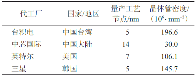 表1 全球主要集成电路制造厂的量产工艺节点及晶体管密度