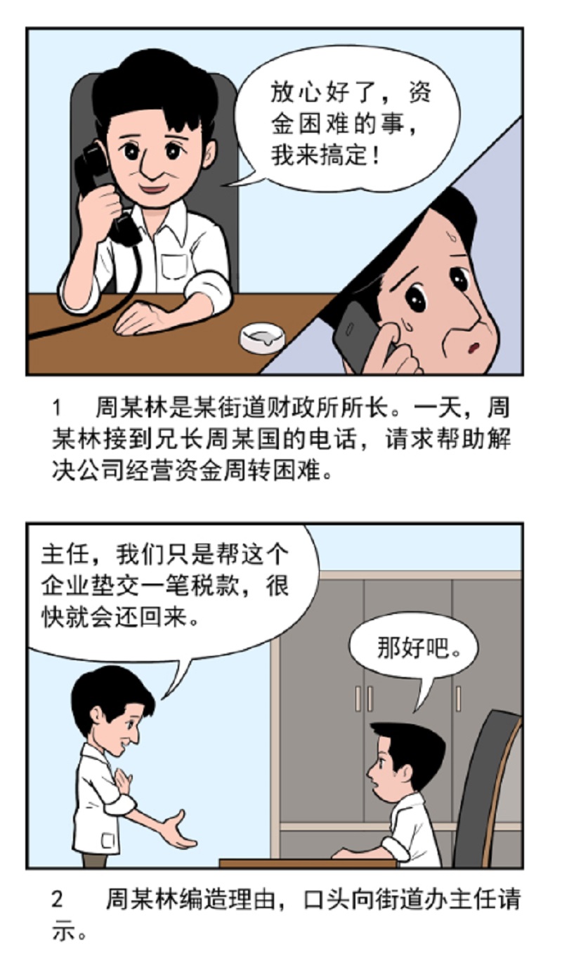 2015年5月8日,时任Y市某街道财政所所长周某林为帮助解决其兄长某公司法定代表人周某国经营周转困难,周某林向街道办事处主任口头请示后,以为企业垫交税款为名,安排工作人员将该街道办事处财政资金一百万元转账至其兄长公司账户,并约定一月内归还。同月15日、22日,周某国通过公司账户和其个人账户分两笔各五十万元将资金归还。