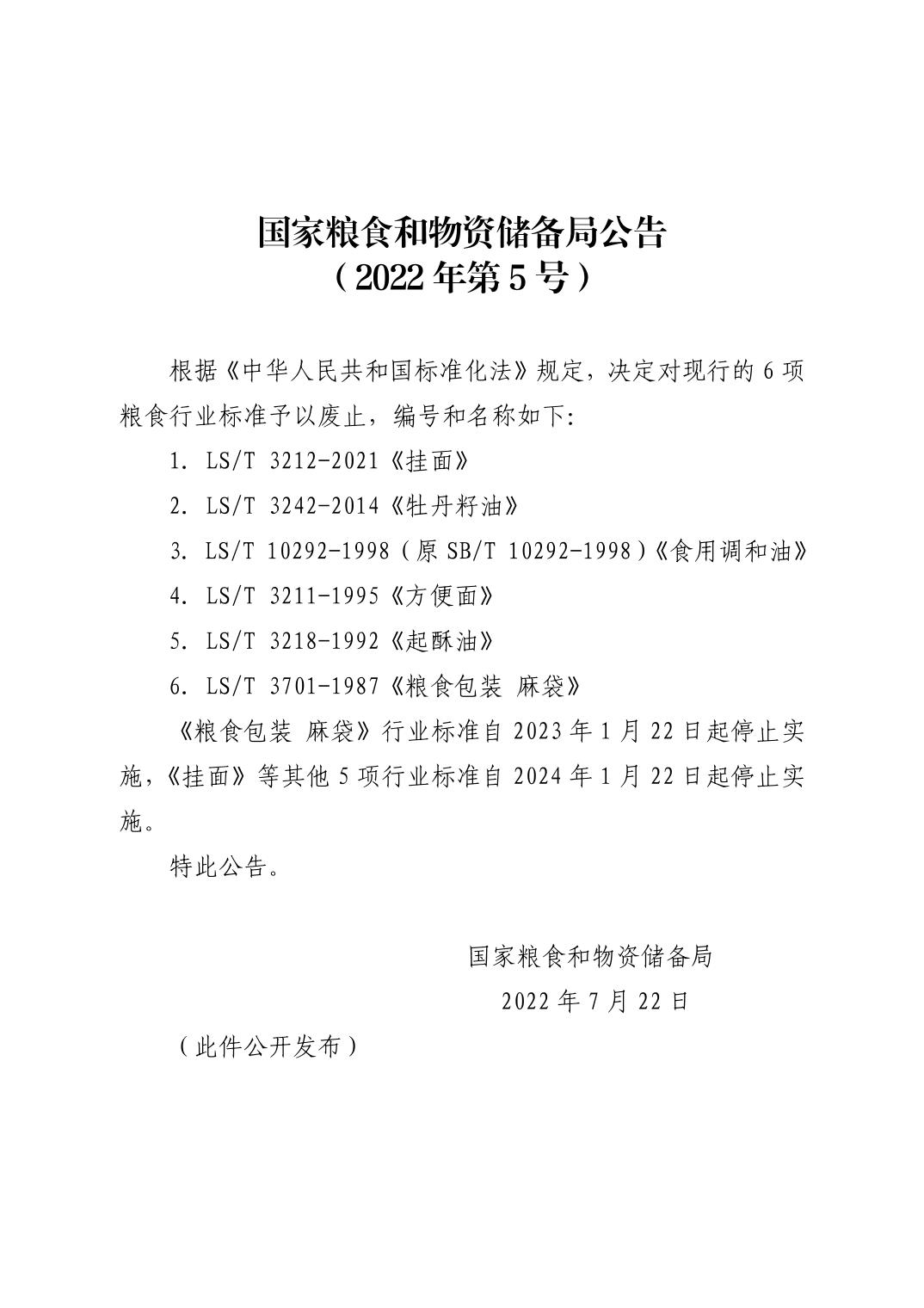 国家粮食和物资储备局公告(2022年第5号)