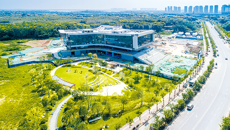 葛店开发区文体公园图书馆是葛店开发区文化民生补短板重点工程,位于学府路与春风路交汇处,占地面积约70亩,总建筑面积1.8万平方米,于去年8月开工建设,目前正在进行室内外装饰装修,预计今年底前完工。图为10月12日航拍建设中的葛店开发区文体公园图书馆。全媒体记者 方仲华 摄