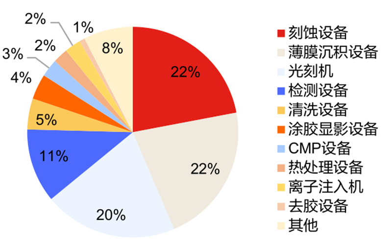 晶圆制造设备是半导体设备行业需求最大的领域,光刻、刻蚀和沉积设备为主要组成部分。根据SEMI数据来看,目前半导体设备主要为晶圆制造设备,市场占有率超过 85%。其中,刻蚀机、薄膜沉积、光刻机设备为半导体设备的核心设备,这三类半导体设备的市占率分别为22%、22%和20%。