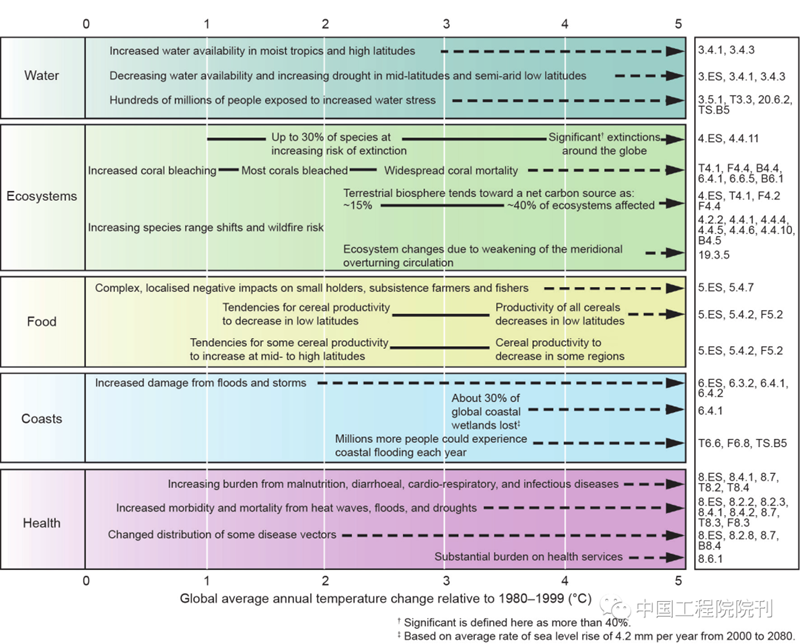 图2. IPCC AR4中与全球平均温度变化有关的影响实例。