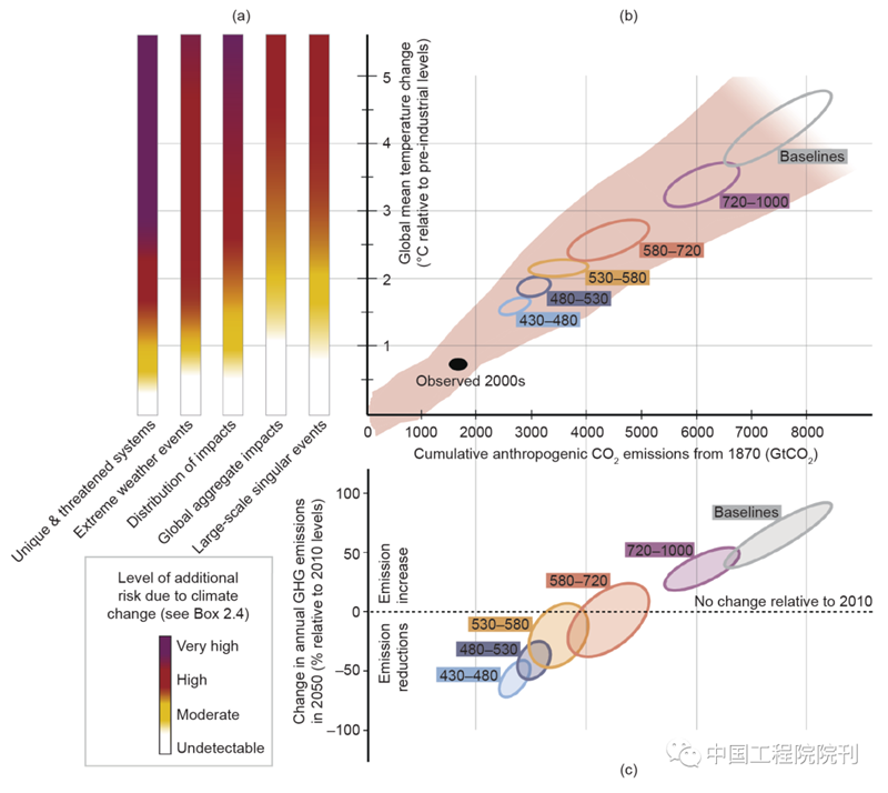 图3. 到2050年,气候变化、温度变化、累积的二氧化碳排放量以及温室气体年排放量变化等风险之间的关系:(a)限制关切理由中的风险;(b)意味着限制CO2 累积排放量;(c)可在未来几十年限制温室气体年排放量。
