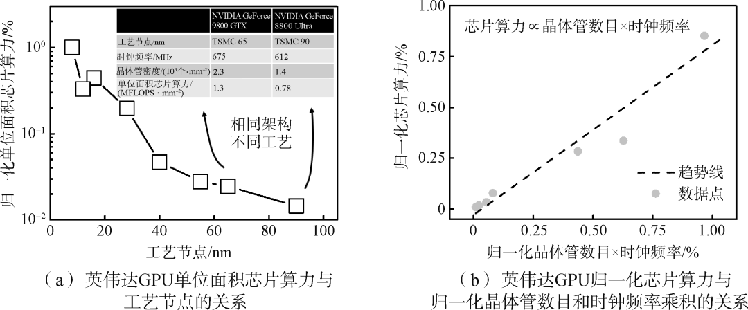 按照摩尔定律经验,集成电路上可以容纳的晶体管数目每18个月便会提升1倍。集成电路制造工艺按照摩尔定律不断发展,目前先进制程已进入3 nm节点。摩尔定律下的集成电路尺寸微缩能带来单位面积算力的指数提升,不仅可以提升单位面积的晶体管数目,还能通过提升时钟频率来提升单位晶体管算力,从而提高芯片总算力(式(1))。图1统计了英伟达GPU算力与工艺制程的关系。图1(a)显示GPU单位面积芯片算力随工艺节点的进步而提升,横坐标为不同工艺制程节点,纵坐标为对数坐标下的归一化单位面积算力。图1(a)内表格对比了65 nm和90 nm制程下的帕斯卡(Pascal)架构GPU,可以看到,先进工艺节点晶体管密度和工作频率均显着提高,从而带来芯片整体算力的提升。图1(b)对应总结了GPU归一化芯片算力与归一化晶体管数目和时钟频率乘积的关系,表明先进工艺是芯片算力提升的关键推动力。近年来,英伟达、超威、苹果的高算力芯片均采用7、5 nm先进制程实现。
