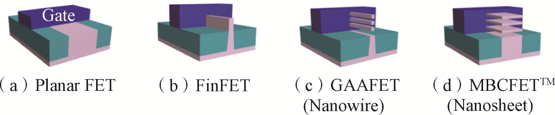 随着集成电路工艺节点的不断进步,摩尔定律发展受到非理想物理效应和工艺成本等诸多限制,其中主要的挑战一方面在于光刻技术,另一方面在于器件的短沟道效应。光刻是集成电路制造的核心工艺,决定了器件的空间尺度。为满足先进制程需求,将采用极紫外(Extreme Ultra-Violet, EUV)光刻机。EUV直接将光源波长从193 nm缩短至13.5 nm,通过将整个光路放置在真空环境下,把透镜组变成反射镜组等方式,减小了短波长光在光路中的损耗。采用EUV结合各种先进工艺技术,实现3 nm工艺节点没有障碍,但面临成本控制、光源波长缩短和光源稳定性问题。短沟道效应是指随器件尺寸微缩达到物理极限,量子效应和非理想因素将逐渐显现,影响器件性能,包括阈值电压降低、漏致势垒降低、载流子表面散射和热电子效应等。增加栅控能力是抑制短沟道效应的关键,为此,集成电路制造已从平面工艺发展为鳍式场效应晶体管(Fin Field-Effect Transistor, FinFET)工艺,通过增加栅极维度改善栅控效果。随着工艺节点往3、2 nm发展,将需要全新器件结构实现更强的栅控,基于环栅场效应晶体管(Gate-All-Around Field-Effect Transistor, GAAFET)和多桥通道场效应晶体管(Multi-Bridge-Channel Field-Effect Transistor, MBCFET)器件结构的制造流程将成为主流(图2)。