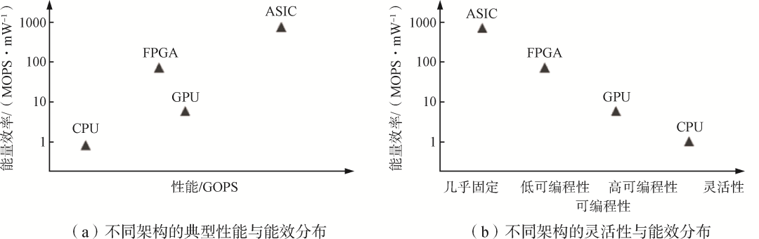 计算架构的好坏影响了芯片单位晶体管能提供的算力水平,是决定芯片算力的本质因素。架构设计需要在通用性和高效性间平衡,以适应不同的应用场景。图4展示了传统计算芯片的架构特点。传统计算硬件以CPU和通用图形处理器(GPGPU)为代表,基于冯·诺依曼架构完成通用计算。CPU使用了复杂的流水线和控制逻辑,并依托指令集实现硬件开发和软件编程解耦,具有高度可编程性,是最通用、最灵活的计算芯片。虽然软件生态成熟,但无法兼顾高算力,因此性能受到限制。GPGPU则采用众核架构,由众多简单的并行计算单元提供算力支持,更加注重众核的高性能,一般作为对高并行度任务的加速处理单元使用。此外,还有依托于现场可编程逻辑门阵列(Field-Programmable Gate Array, FPGA)和专用集成电路(Application Specific Integrated Circuit, ASIC)的计算芯片:ASIC是专用计算芯片,一般针对具体的应用场景和算法,通过高度定制化来高效解决特定问题,能实现较高的性能,但可编程性和通用性较差;FPGA是一类基于现场可编程逻辑阵列的计算芯片,虽然不能做到GPU级别的并行加速或ASIC级别的能效比,但是可以提供硬件编程能力。