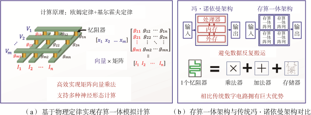 传统冯·诺依曼架构中,存算分离的方式使得数据搬运成为系统性能的瓶颈,不适合大数据场景下的高算力应用。近存计算架构和存算一体架构将从减少数据访存开销出发,实现高算力、高能效芯片。3.2.1 近存计算近存计算通过缩短计算单元和存储单元的距离,从而缓解访存带宽瓶颈,提升数据的互连系数,有效提高受限于带宽的芯片算力。近存计算往往通过在计算芯片内部集成更多的存储单元,或者增加存储单元和计算单元的带宽,来降低数据搬移的开销。英伟达和AMD的高性能GPGPU均采用高带宽内存(High Bandwidth Memory, HBM)技术,通过堆叠高带宽内存,实现高效数据传输;新型高算力AI芯片,如Graphcore和Cerebras WSE(Wafer Scale Engine),通过片上集成更多SRAM单元实现高算力人工智能加速器;三星通过在动态随机存取存储器(DRAM)存储单元内部集成计算逻辑来实现近存计算;阿里达摩院和紫光同芯合作,通过3D混合键合的方式将计算逻辑和存储单元垂直集成在一起,实现高算力。3.2.2 存算一体存算一体,特别是基于忆阻器的存算一体技术,能在近存计算的基础上更进一步实现计算和存储的器件级融合,存储单元同时也是执行单元。构成存算一体的底层器件包括阻变式随机存取存储器(RRAM)、SRAM、相变随机存取存储器(PCRAM)、磁性随机存取存储器(MRAM)等多种存储器件,其中RRAM具有非易失、高存储密度、功耗低以及互补金属氧化物半导体(Complementary Metal-Oxide-Semiconductor, CMOS)工艺兼容等优势,基于RRAM构建交叉阵列,在本地完成高并行的模拟计算(图5),实现算力突破。清华大学钱鹤、吴华强团队积极布局,研发28 nm忆阻器产线,发布了首颗全系统集成的忆阻器存算一体原型芯片和软件工具栈,能效比GPGPU提高2个数量级;北京大学、中国科学院、复旦大学、浙江大学等也在器件、算法和模型等方面有所突破。国外国际商业机器公司(IBM)、惠普和英特尔等公司,以及麻省理工学院、斯坦福大学、加州大学伯克利分校等高校,从器件、架构和工具链出发,布局存算一体高算力芯片研究。