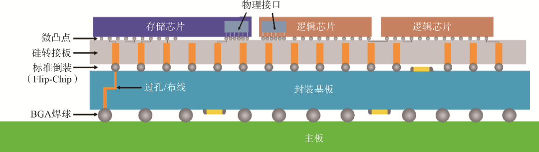 2.1 先进封装技术芯粒封装技术中,按照封装结构可以分为2D、2.5D和3D。不通过额外中介层,直接在有机基板上互连芯片的形式称为2D封装,该方案成本低,但互连线的密度不高,采用高速串行互连技术一定程度上可以弥补低带宽问题。台积电的基板上晶圆上的芯片(Chip on Wafer on Substrate, CoWoS)技术是典型的2.5D封装技术,即通过硅转接板实现多颗芯片的互连和集成(图8)。封装体内多颗芯片水平排布通过倒装互连在硅转接板上,并在硅转接板上完成高密度金属互连线,随后通过硅通孔(Through Silicon Via, TSV)将信号引出至封装基板。目前主流的2.5D先进封装技术还包括以英特尔的EMIB技术为代表的硅桥衍生技术等。2.5D封装中,硅转接板上互连线密度更高,距离更短,速度更快,但是成本也较高,且存在应力问题。