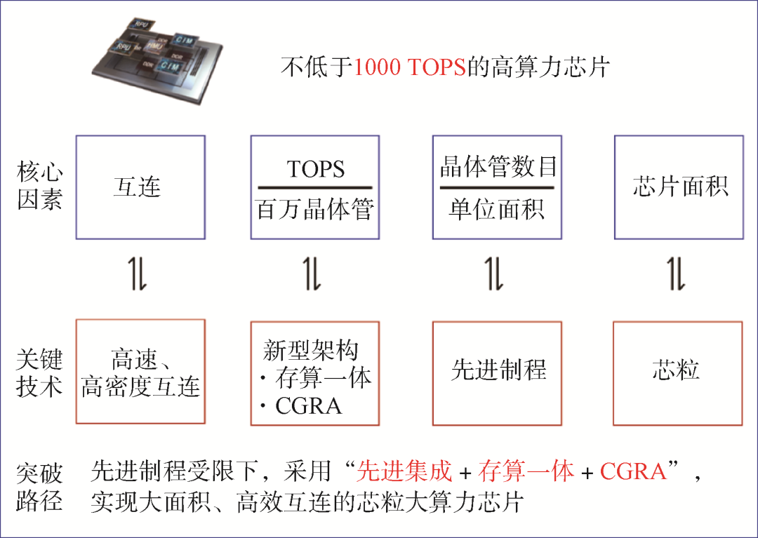 另外,现阶段大国博弈加剧全球产业链、供应链重构,同时中国集成电路先进工艺的开发受到制约,单纯依靠先进制程等技术的单点突破成本高、周期长。因此,在补全产业链短板、攻坚关键技术的同时,还应充分利用现有产业链和研究基础,从系统层次布局多途径协同方案,采用国内成熟、领先的技术和计算架构,摸索更加高效可行的技术路径。为实现高算力芯片不断突破,需要扎根于中国现有产业基础,探寻底层计算架构的变革性方法,探索“架构+集成+系统”协同一体的自主可控创新路径。采用成熟制程和先进集成,结合CGRA和存算一体等国内领先的新型架构,在芯粒技术基础上实现晶圆级的高算力芯片是一条可行的突破路径,该路径能够利用现有优势技术,在更低的成本投入下,更快地提升芯片算力。