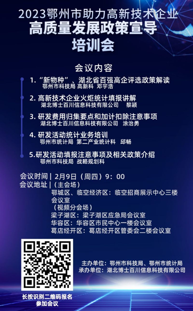 为支持全市高新技术企业高质量发展,更加顺利地完成火炬统计年报的填报,我市将于2023年2月9日上午9:00在全市范围内开展相关业务培训。鄂城区、临空经济区设主会场,地址在临空招商展示中心三楼会议室;梁子湖区应急局会议室、华容区市民中心一楼会议室、葛店经开区管委会二楼会议室分别设视频分会场,请各高新技术企业安排相关负责人准时参会培训。