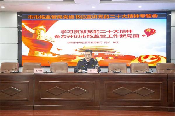 钟文要求,全市市场监管系统要把学习贯彻党的二十大精神与贯彻落实党的二十大报告中提出的“构建全国统一大市场,建设高标准市场体系”“完善产权保护、市场准入、公平竞争、社会信用等市场经济基础制度,优化营商环境”“加强反垄断和反不正当竞争”“加快建设质量强国”“加强知识产权法治保障”等一系列部署结合起来,与贯彻落实服务鄂州“两区一枢纽”发展目标全过程中,在新的征程上奋力谱写市场监管新篇章。要紧紧围绕优化营商环境,积极参与全国统一大市场建设,要紧紧围绕质量强国建设,全力服务鄂州高质量发展,要紧紧围绕增进民生福祉,忠实践行市场监管职责使命,要紧紧围绕全面从严治党,着力打造政治过硬、业务过硬、作风过硬的市场监管铁军。要做好三个结合,真抓实干,做出成绩,确保党的二十大精神在全市市场监管系统落实落地,将党的二十大提出的新思想新思路新目标新部署新要求贯彻到市场监管各项工作中,不断把贯彻落实党的二十大精神转化为开创市场监管事业发展新局面的强大动力,创造性谋划好明年的工作思路,确保明年高起步、开好局,确保党的二十大精神全面贯彻落实到mobilebet123365_365bet注册送奖金_365商城官网场监管全过程各方面,全力服务鄂州“两区一枢纽”发展目标,为全面建设社会主义现代化国家、全面推进中华民族伟大复兴做出新的更大贡献。