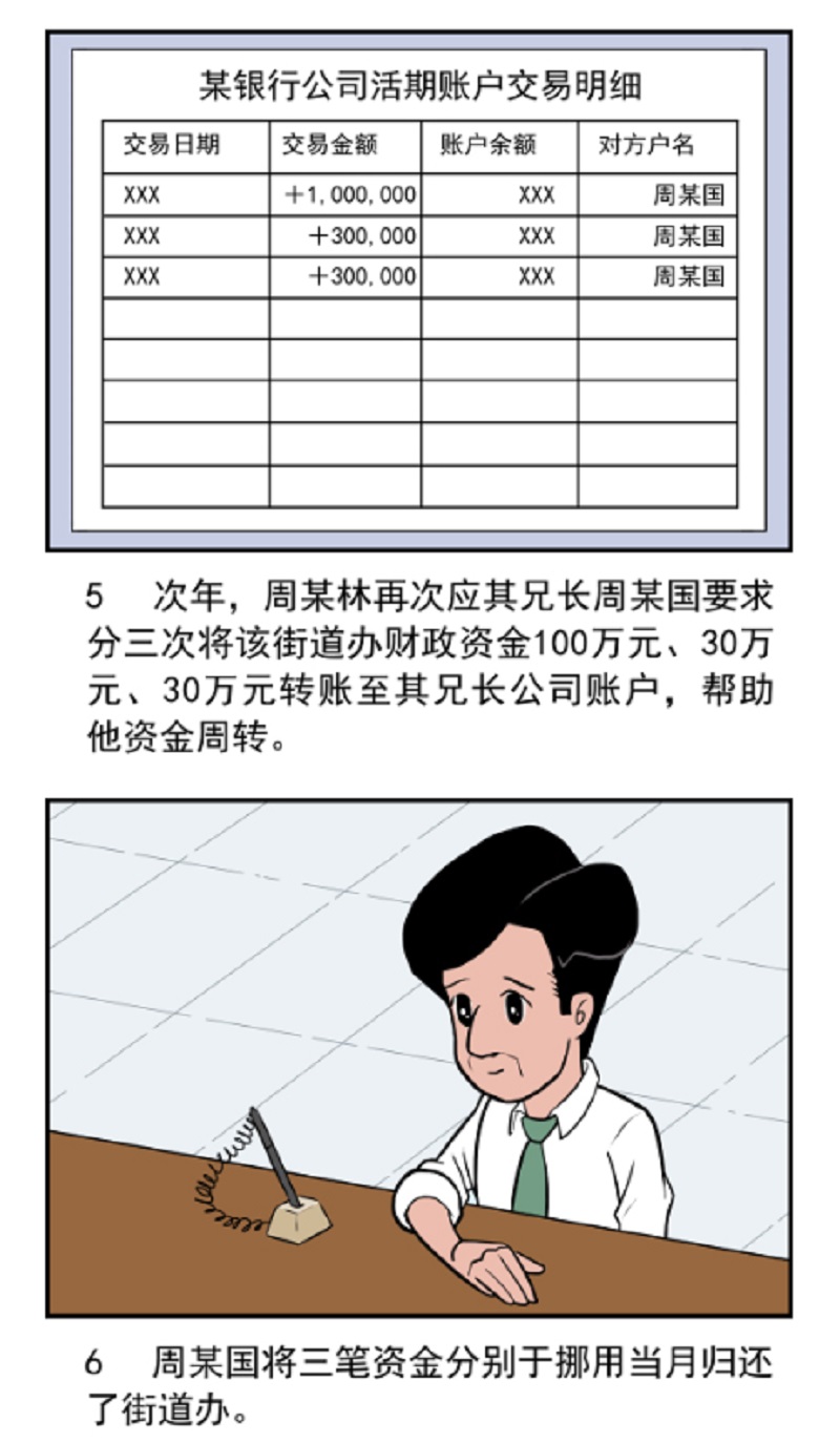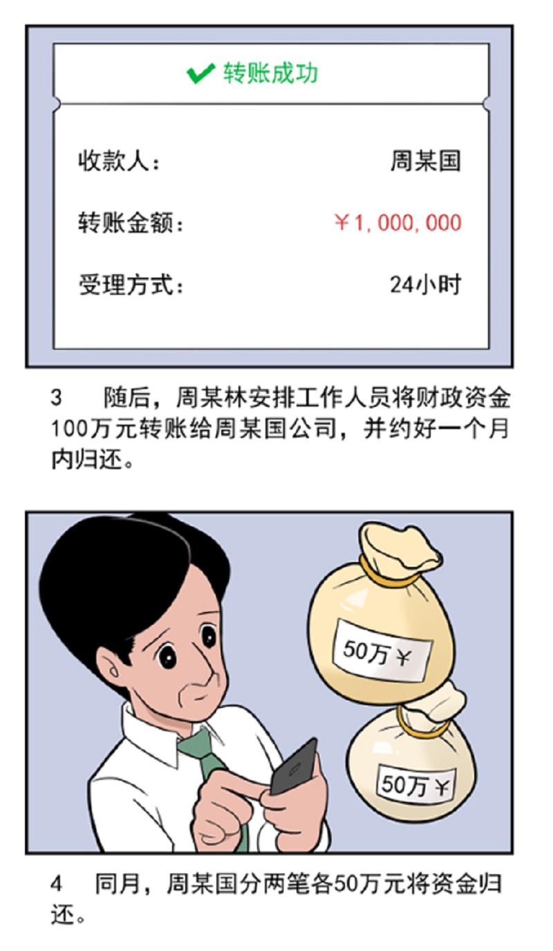 2015年5月8日,时任Y市某街道财政所所长周某林为帮助解决其兄长某公司法定代表人周某国经营周转困难,周某林向街道办事处主任口头请示后,以为企业垫交税款为名,安排工作人员将该街道办事处财政资金一百万元转账至其兄长公司账户,并约定一月内归还。同月15日、22日,周某国通过公司账户和其个人账户分两笔各五十万元将资金归还。