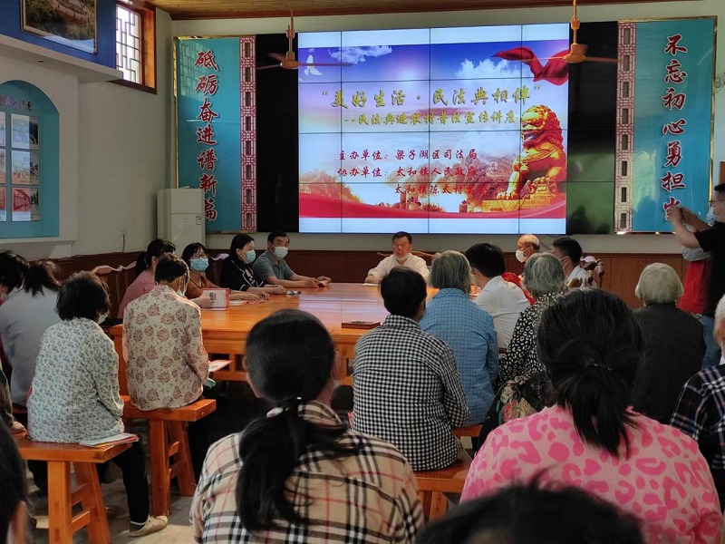 为深入学习贯彻习近平法治思想,特别是习近平总书记关于加强民法典学习宣传的重要指示精神,让民法典走到群众身边、走进群众心里,进一步增强农村村民的法律意识,提高农村村民尊法、学法、守法、用法的能力,营造和谐稳定的社会氛围,5月7日上午9点,梁子湖区司法局组织全体干部职工到太和镇陈太村开展“美好生活·民法典相伴”--民法典进农村法治宣传活动。