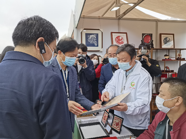 鄂州非遗展位集中展示了鄂州雕花剪纸、青铜镜修复及复制技艺、东坡饼等多个非遗项目。雕花剪纸传承人顾德“新鲜出炉”的剪纸作品受到众多游客追捧;巧夺天工的古铜镜、酥脆美味的东坡饼,吸引大量观众驻足。