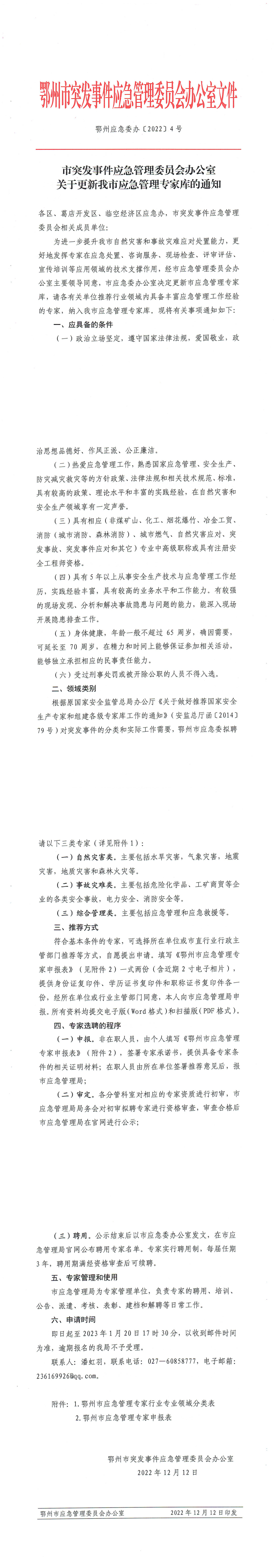 | 索 引 号: | 011217651/2022-02168 | 发文字号: | 鄂州应急委办【2022】4号 | 发文日期: | 2022年12月12日 |