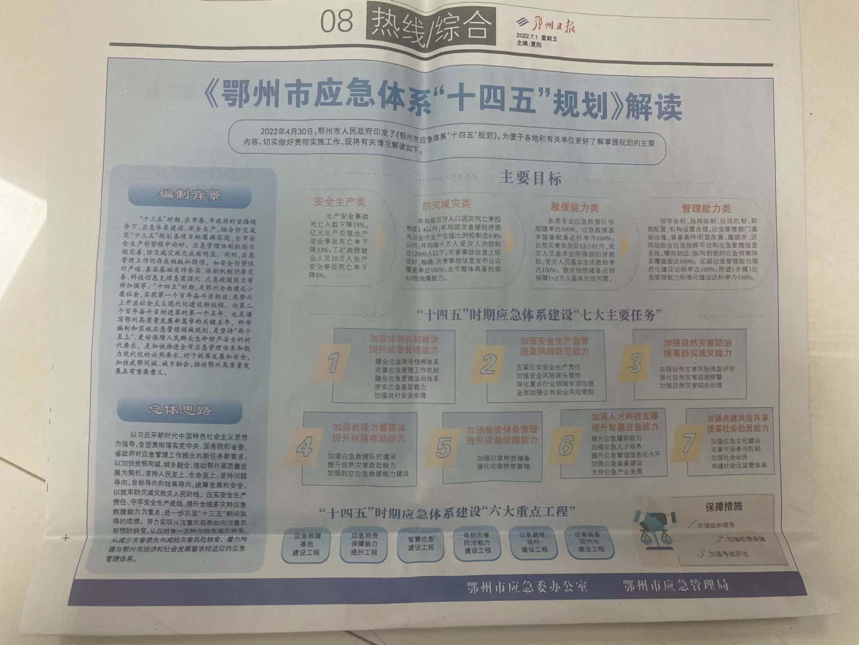 着力“补短板、强弱项、打基础、管长远”,谋划了“六项”应急基础建设工程,包括应急救援基地建设工程、应急物资保障能力提升工程、智慧应急建设工程、自然灾害防治能力建设工程、应急避难场所建设工程、应急装备现代化建设工程。