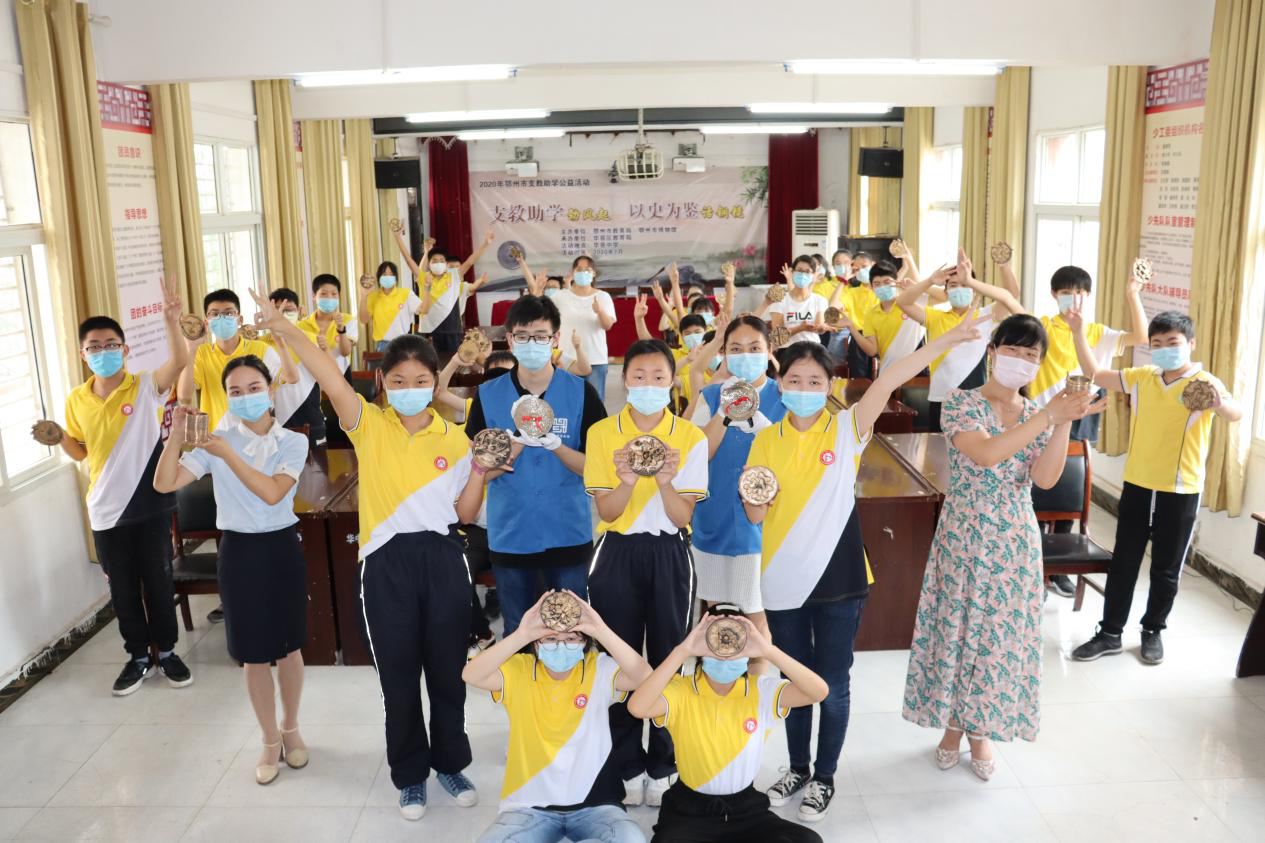 (图为支教人员与学生一起展示自制的铜镜作品)