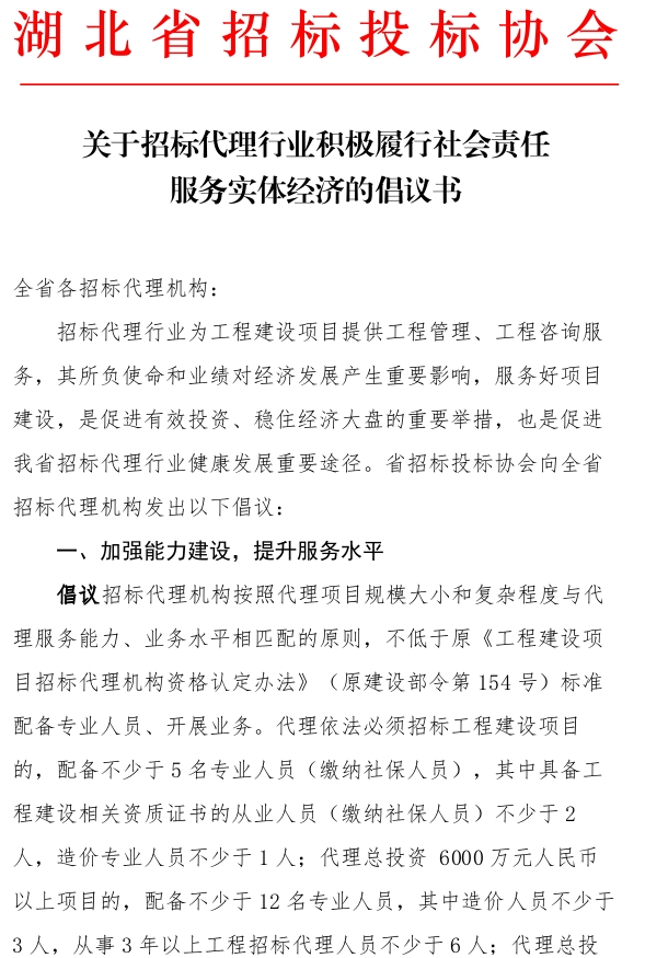 关于招标代理行业积极履行社会责任服务实体经济的倡议书